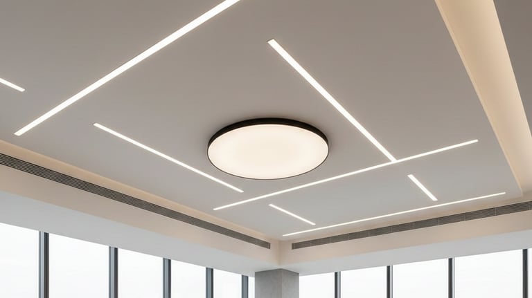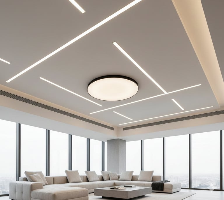 Gypsum boards fixed with cutouts, staggered joints, screws, and perimeter details for crack-free stability. Joint treatment, skim coating, and finishing yield paint-ready surfaces, supporting stepped/recessed designs with lighting, grilles, and access.