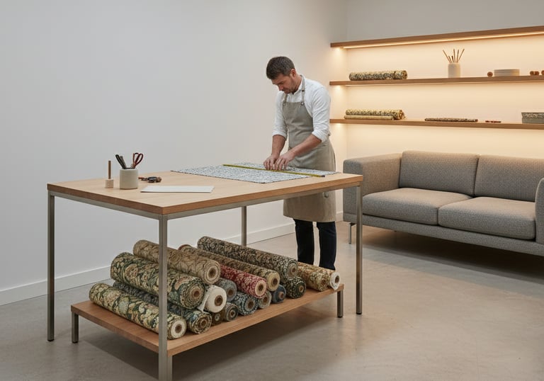 Integrates with joinery, fitout for bases, panel substrates, concealed fixings. Site templating, mock-ups confirm ergonomics/dimensions pre-production. On-site fitting/stretching adjusts for sockets, lighting, grilles, features; protection coordinates handover.